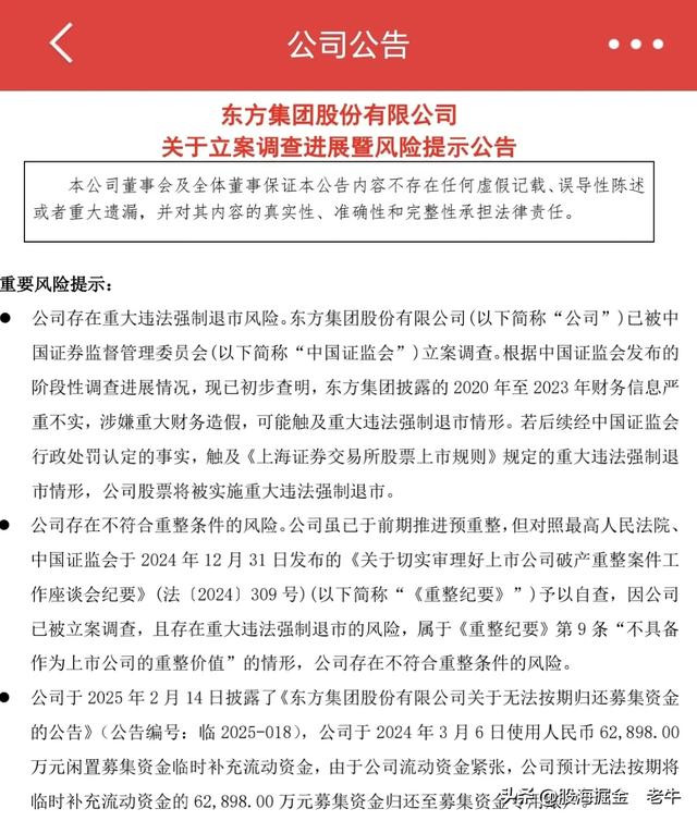 1.经初步调查,东方集团披露的2020年至2023年财务信息严重不实,涉嫌重大财务造假,可能触及重大违法强制退市情形。